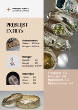 Enjoy a peaceful atmosphere, hands-on instruction, and the freedom to focus on creating a unique silver piece without any rush. 10 grams of silver clay is provided for each person at a standard price of €170 pp . With this it is possible to make several small or 1 big article. Parts are also provided to make earrings or pendants in addition to rings. Gold paste is also provided so that a gold layer can be applied to the silver. The extra parts such as clasps and stones are not included in the fixed price per person.